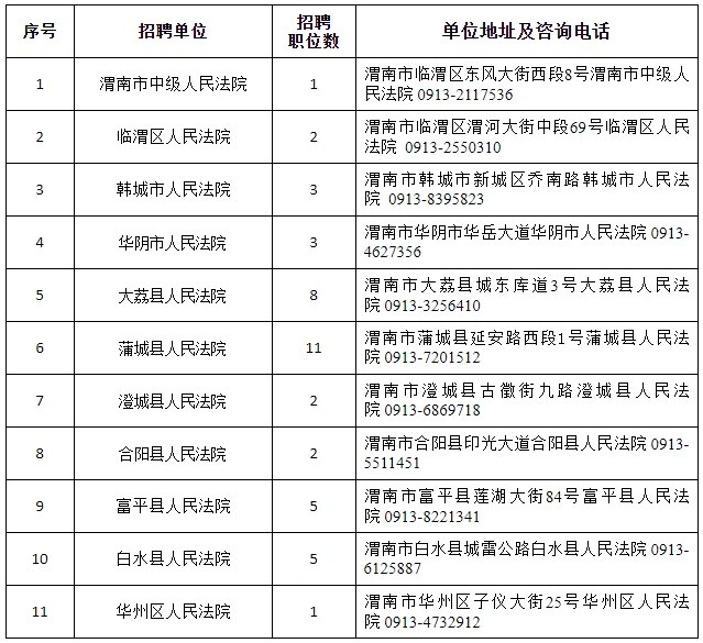 根據(jù)工作需要及相關(guān)政策規(guī)定,經(jīng)陜西省高級(jí)人民法院批準(zhǔn),渭南市法院系統(tǒng)面向社會(huì)公開(kāi)招聘聘用制書記員?,F(xiàn)將有關(guān)事項(xiàng)公告如下: